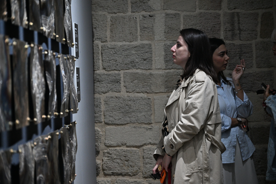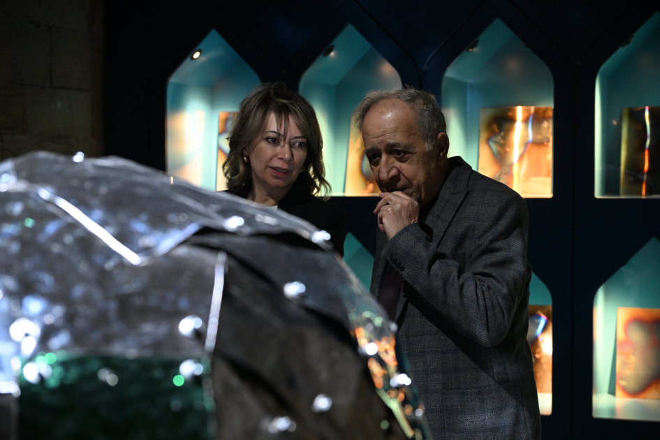 Sərgidə rəssam Vüsalə Ağarəziyeva Şirvanşahlar Sarayını gecə ilə sübh arasındakı o incə, düşüncəli məqama çevrilən kontemplativ bir məkana bənzədir.
