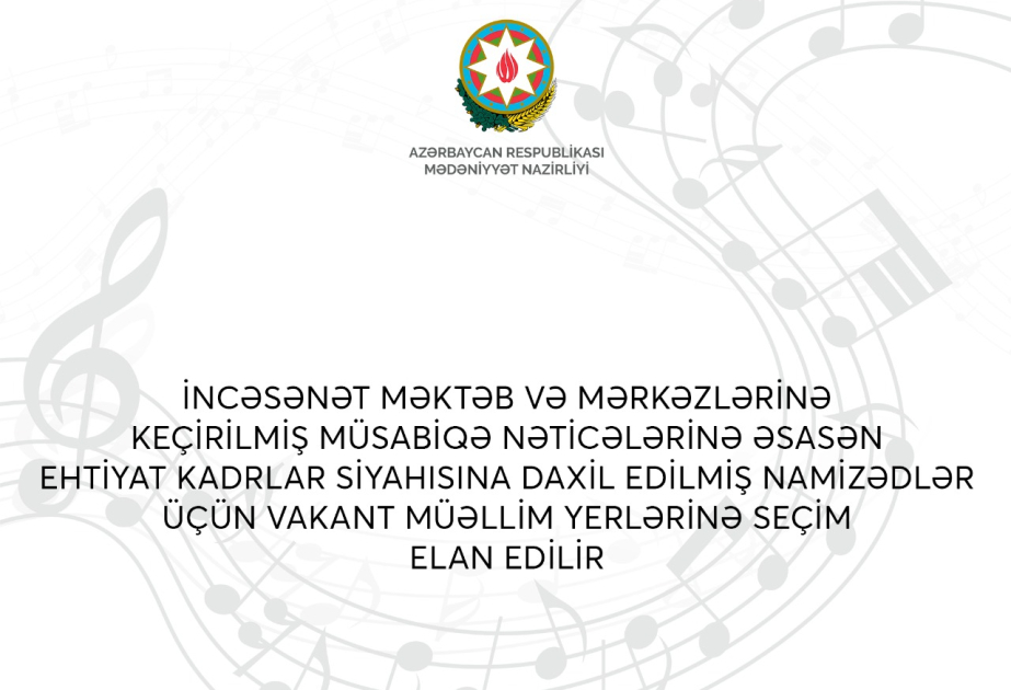 İncəsənət məktəb və mərkəzlərinə keçirilmiş müsabiqə nəticələrinə əsasən ehtiyat kadrlar siyahısına daxil edilmiş namizədlər üçün vakant müəllim yerlərinə seçim elan edilib.