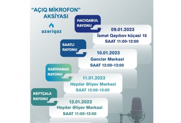 Növbəti həftə (yanvarın 9-11 və 13 tarixləri) daha 4 rayonda vətəndaşlarla “Açıq mikrofon” aksiyaları keçiriləcək.