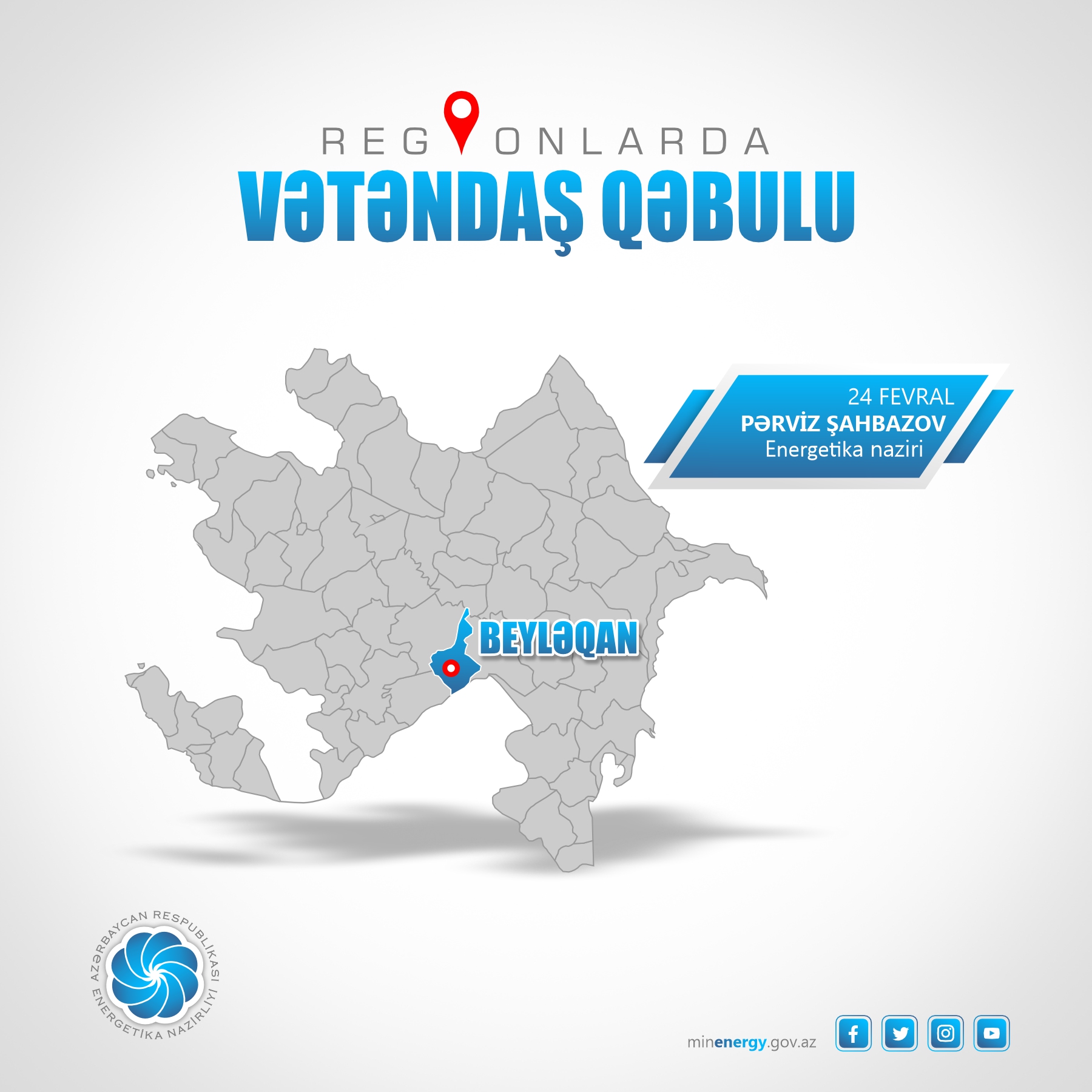 Energetika naziri Pərviz Şahbazov fevralın 24-də Beyləqan, Ağcabədi, Füzuli və Xocavənd rayonlarından olan vətəndaşları qəbul edəcək. SİA xəbər verir ki, qəbul saat 11:00-dan etibarən Beyləqan rayon Heydər Əliyev mərkəzində (ünvan: Beyləqan şəhəri, H.Əliyev pr. 7) keçiriləcək.