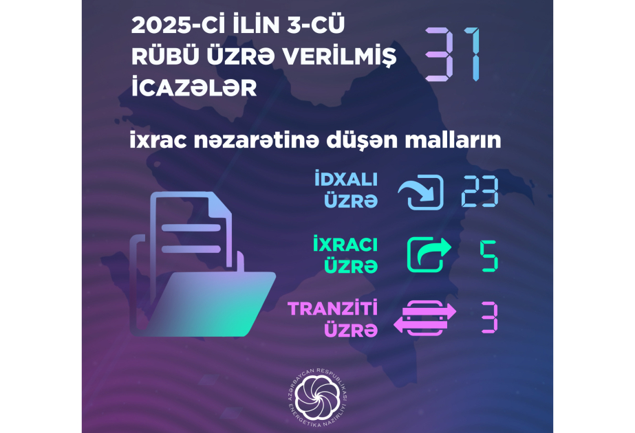 Cari ilin 3-cü rübü ərzində Energetika Nazirliyi tərəfindən 31 icazə verilib. Nazirlikdən SİA-ya bildirilib ki, “İxrac nəzarətinə düşən mallar (işlər, xidmətlər, əqli fəaliyyətin nəticələri) üzrə xüsusi icazənin verilməsi” Qaydalarına uyğun olaraq, ixrac nəzarətinə düşən malların idxalı üzrə 23, ixracı üzrə 5 və tranziti üzrə 3 icazə verilib.