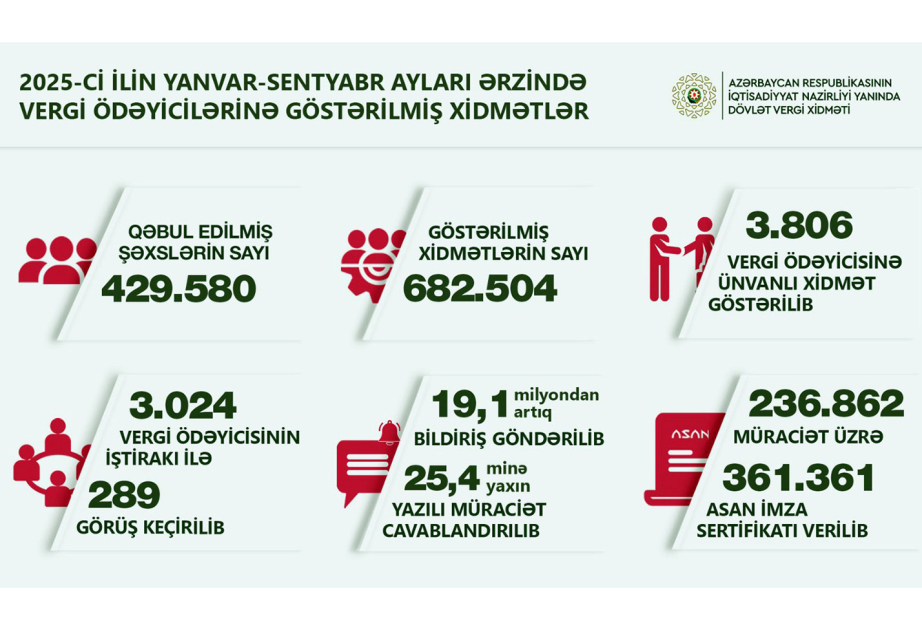 Vergi ödəyicilərinin preventiv məlumatlandırılması məqsədilə onların mobil nömrələrinə 2 milyon 215 minə yaxın SMS göndərilib. Yanvar-sentyabr ayları ərzində ümumilikdə 236 min 862 müraciət üzrə 361 min 361 sayda “ASAN İmza” sertifikatı verilib.