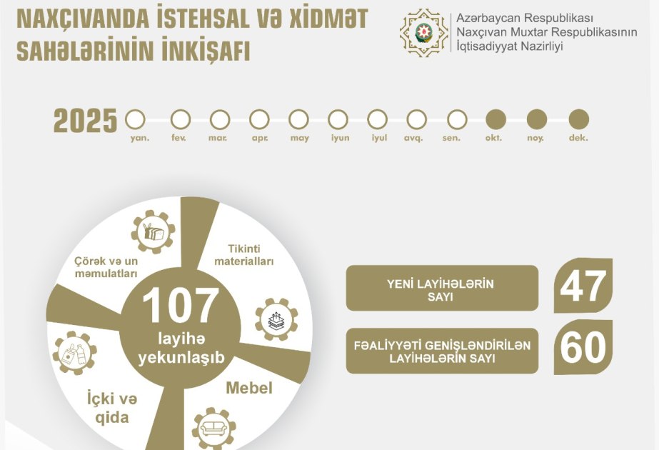 Naxçıvan Muxtar Respublikasında hər bir rayonun əmək və xammal ehtiyatlarından səmərəli istifadə yolu ilə yeni istehsal və xidmət sahələrinin yaradılması davam etdirilir. Naxçıvan Muxtar Respublikası İqtisadiyyat Nazirliyinin mətbuat xidmətindən SİA-nın bölgə müxbirinə bildirilib ki, bu istiqamətdə həyata keçirilən layihələr nəticəsində 2025-ci ilin yanvar-sentyabr ayları ərzində müxtəlif təyinatlı 107 istehsal və xidmət sahəsi fəaliyyətə başlayıb.