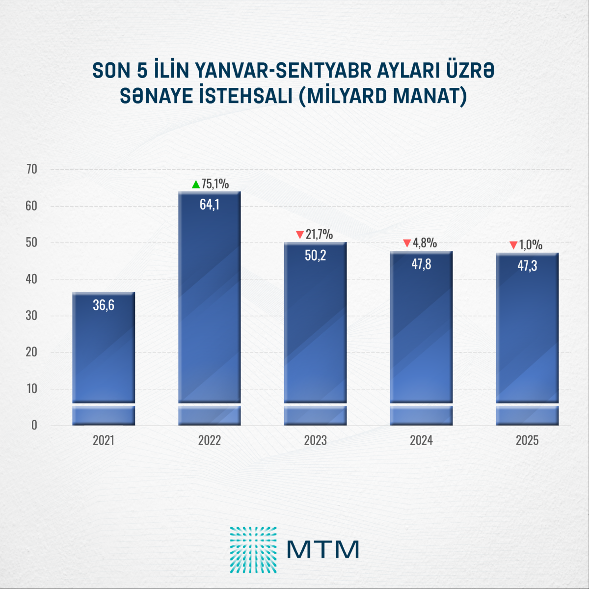 Media Təhlil Mərkəzinin (MTM) Dövlət Statistika Komitəsinin verdiyi rəsmi məlumatlar əsasında apardığı təhlilə görə, son 5 ilin yanvar-sentyabr ayları üzrə ən yüksək sənaye istehsalı həcmi 2022-ci ilə təsadüf edib. SİA xəbər verir ki, həmin dövrdə ölkədə sənaye istehsalı həcmi 64,1 milyard manat olub. Bu dövrdən sonrakı illərdə isə sənaye istehsalı həcmində davamlı olaraq hər il azalmalar müşahidə edilir.