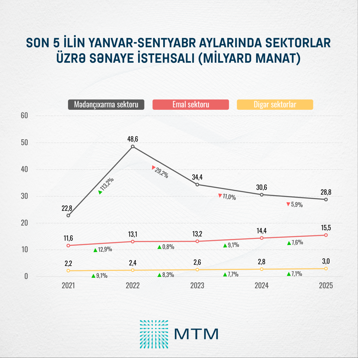 Lakin, mədənçıxarma sektorunda istehsal həcmi yanvar-sentyabr ayları üzrə son 4 ildə davamlı olaraq azalır. Son olaraq, cari ilin ilk 9 ayında ölkədə mədənçıxarma sektoru üzrə sənaye istehsalı 28,8 milyard manat olub ki, bu da ötən ilin eyni dövri ilə müqayisədə 5,9 % və ya 1,8 milyard manat azdır.
