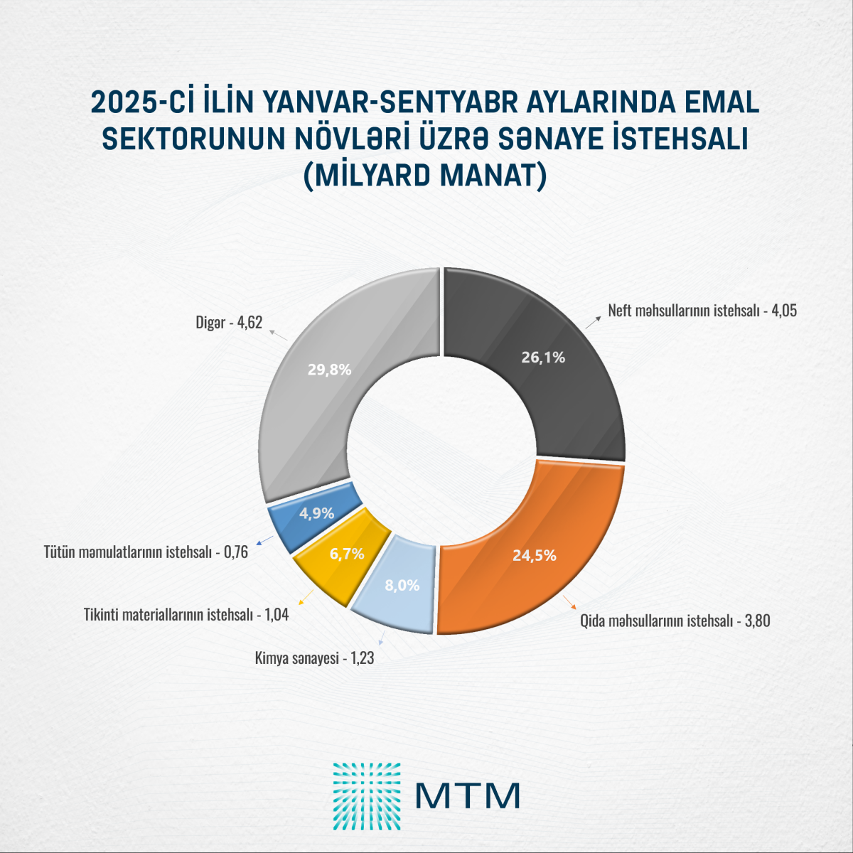 Növbəti üç sırada isə ardıcıl olaraq kimya sənayesi (1,23 mlrd manat ), tikinti materiallarının istehsalı (1,04 milyard manat ) və tütün məmulatlarının istehsalı (0,76 milyard manat) dayanır. Qalan 4,62 milyard manat isə digər məhsulların istehsalı həcmidir.