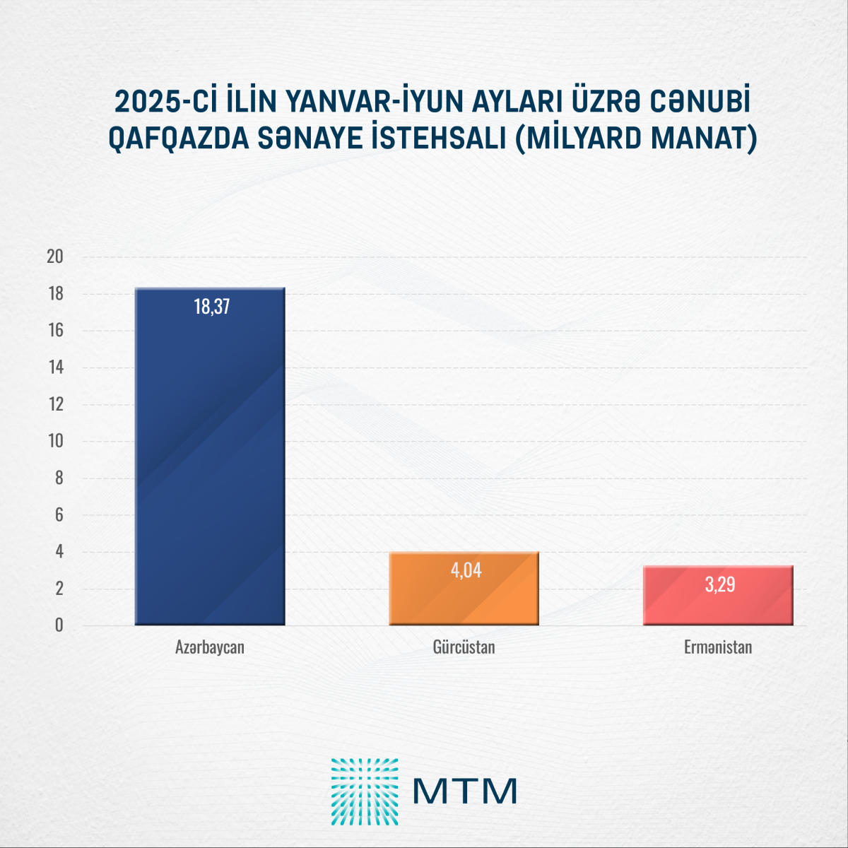 Rəsmi məlumatlara əsasən, cari ilin yanvar-iyun aylarında Azərbaycanda sənaye istehsalının həcmi 18,37 milyard dollar olub. Bu göstərici Gürcüstanının sənaye istehsalı həcmində 4,5 dəfə, Ermənistanın sənaye istehsalı həcmindən isə 5,6 dəfə çoxdur.