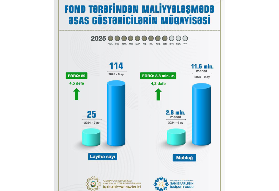Naxçıvan Muxtar Respublikası Sahibkarlığın İnkişafı Fondu 2025-ci ilin yanvar–sentyabr ayları ərzində 114 layihənin maliyyələşdirilməsinə 11,6 milyon manat məbləğində güzəştli kredit vəsaiti ayırıb. Sahibkarlığın İnkişafı Fondundan SİA-nın bölgə müxbirinə verilən məlumata görə, bu, ötən ilin eyni dövrü ilə müqayisədə 8,8 milyon manat və ya 4,2 dəfə çoxdur. Layihələrin sayı isə ötən ilin eyni dövrü ilə müqayisədə 4,5 dəfə artıb.