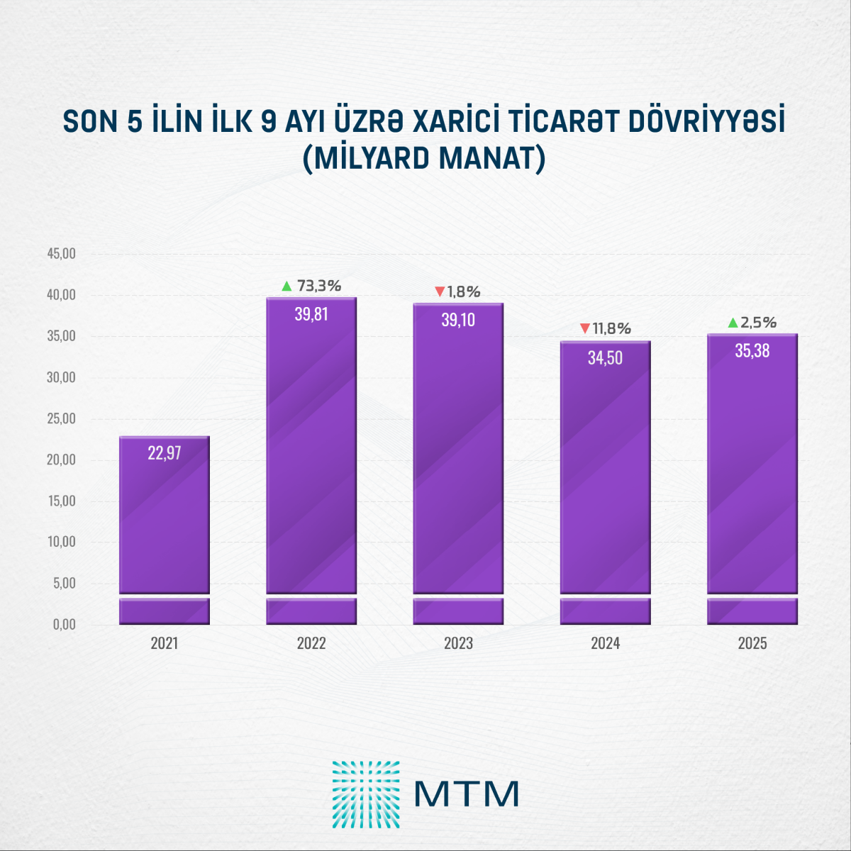 Media Təhlil Mərkəzinin (MTM) Dövlət Gömrük Komitəsinin açıqladığı rəsmi məlumatlar əsasında apardığı təhlilə görə, 2025-ci ilin yanvar-sentyabr aylarında Azərbaycanda xarici ticarət dövriyyəsinin həcmi ötən ilin eyni dövrü ilə müqayisədə 2,5% və ya 0,88 milyard dollar artaraq 35,38 milyard dollara çatıb.