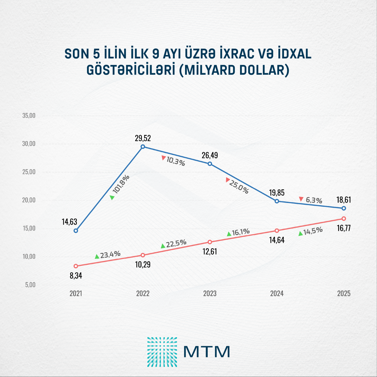 İdxal həcminə gəlincə, 2025-ci ilin ilk 9 ayında bu göstərici ötən ilin eyni dövrü ilə müqayisədə 14,5% və ya 2,13 milyard dollar artaraq 16,77 milyard dollara çatıb.