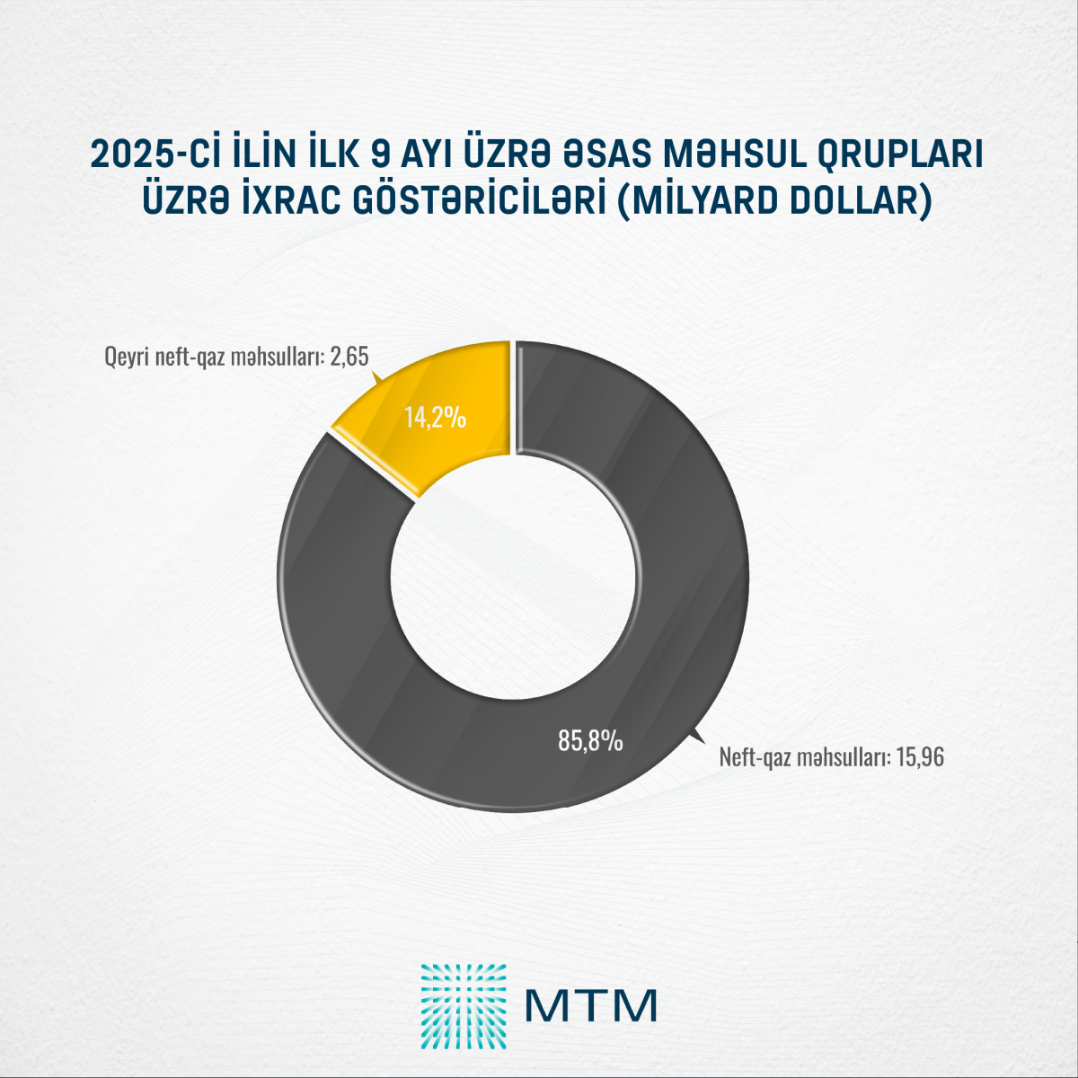 2025-ci ilin yanvar-sentyabr aylarında Azərbaycanın ixrac həcmi 18,61 milyard dollar təşkil edib ki, bu da ötən il eyni dövrünə nisbətən 6,3% və ya 1,25 milyard dollar azdır.
