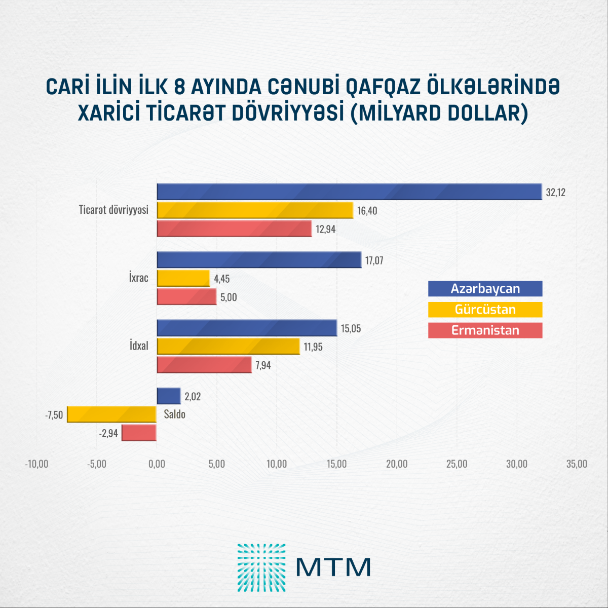 Eyni dövrdə xarici ticarət göstəriciləri nəticəsində Gürcüstanda -7,5 milyard dollar, Ermənistanda isə -2,94 milyard dollar həcmində mənfi saldo yaranıb.