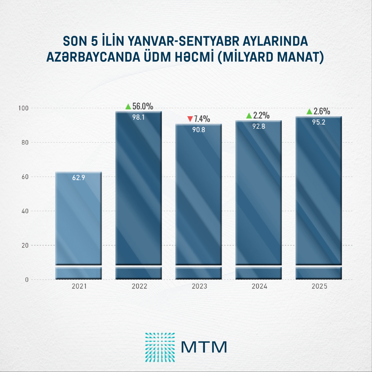 Media Təhlil Mərkəzinin (MTM) Dövlət Statistika Komitəsinin açıqladığı rəsmi rəqəmlər əsasında apardığı təhlilə görə, cari ilin yanvar-sentyabr aylarında ölkədə Ümumi Daxili Məhsul istehsalının həcmi ötən ilin eyni dövrü ilə müqayisədə 2,6% və ya 2,4 milyard manat artaraq 95,2 milyard manata yüksəlib.
