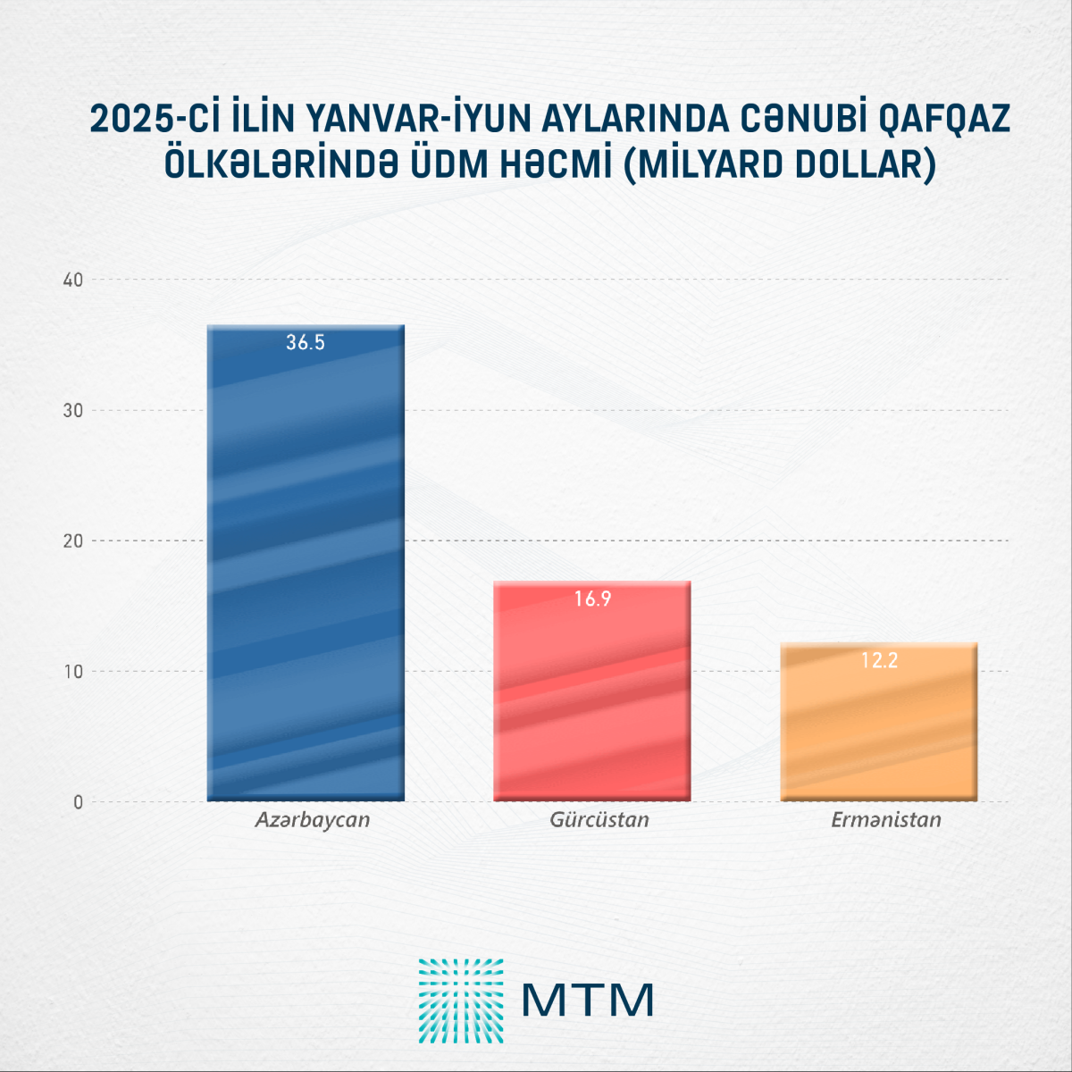 Rəqəmlərlə ifadə etsək, 2025-ci ilin ilk 6 ayında Azərbaycanda ÜDM istehsalı həcmi 36,5, Gürcüstanda 16,9, Ermənistanda isə 12,2 milyard dollar təşkil edib.