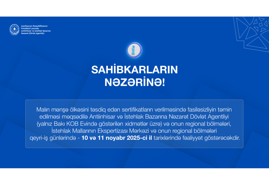 Azərbaycan Respublikasının Prezidenti yanında Antiinhisar və İstehlak Bazarına Nəzarət Dövlət Agentliyi sahibkarlıq subyektlərinə müraciət edib. Dövlət Agentliyindən SİA-ya bildirilib ki, ixrac olunan malların mənşə ölkəsinin müəyyən edilməsi üzrə ekspertizaların keçirilməsi və belə ekspertizaların nəticələrinə uyğun olaraq malın mənşə ölkəsini təsdiq edən sertifikatların verilməsində fasiləsizliyin təmin edilməsi məqsədilə Azərbaycan Respublikasının Prezidenti yanında Antiinhisar və İstehlak Bazarına Nəzarət Dövlət Agentliyi (yalnız Bakı KOB Evində göstərilən xidmətlər üzrə) və onun regional bölmələri (https://competition.gov.az/az/page/haqqimizda/regional-bolmeler), eləcə də İstehlak Mallarının Ekspertizası Mərkəzi və regional bölmələri (https://www.ekspertiza.az/az/haqqimizda/regional-bolmeler) qeyri-iş günlərində – 2025-ci il 10 və 11 noyabr tarixlərində fəaliyyət göstərəcək.
