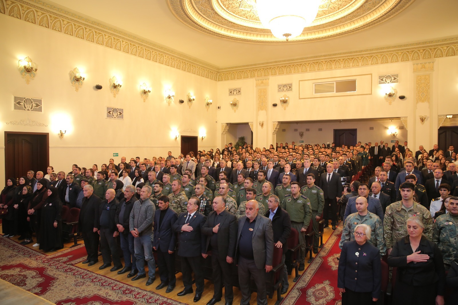 Daha sonra tədbirin rəsmi hissəsinə keçid edilərəkDövlət Himni səsləndirilib və ölkəmizin ərazi bütövlüyü və suverenliyi uğrunda mübarizədə canlarını qurban verən şəhidlərimizin xatirəsi bir dəqiqəlik sükutla yad edilib.