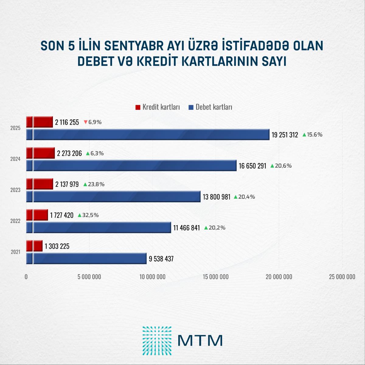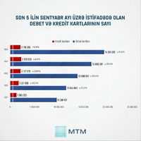 2025-ci ilin sentyabr ayının sonuna olan məlumatlara əsasən, son bir ildə kredit kartlarının sayında azalma müşahidə olunub. Kredit kartlarının sayı 2 116 255-ə düşüb ki, bu da əvvəlki illə müqayisədə 6,9% və ya 156 951 ədəd azalma deməkdir. Debet kartlarının sayı isə artım tendensiyasını davam etdirərək 19 251 312-yə çatıb. Bu göstərici bir il ərzində 15,6% və ya 2 601 021 əlavə debet kartının dövriyyəyə daxil olduğunu göstərir.