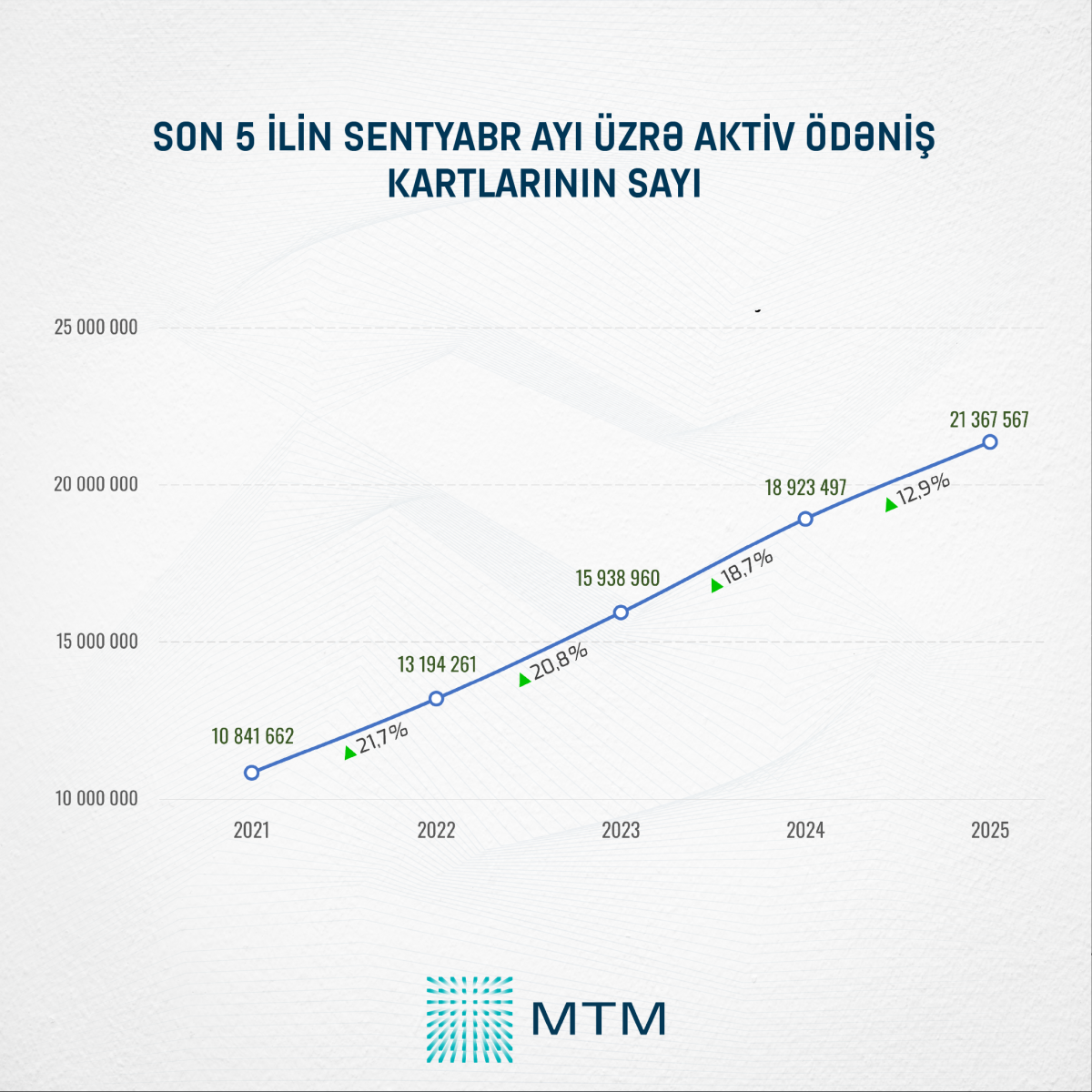 2025-ci ilin sentyabr ayının sonuna olan məlumatlar da artım tendensiyasının davam etdiyini göstərir. Son bir ildə ödəniş kartlarının ümumi sayı 21 367 567-yə yüksəlib. Bu, 2024-cü illə müqayisədə 12,9% və ya 2 444 070 ədəd artım deməkdir.