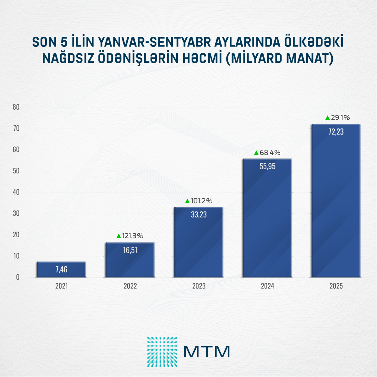 2025-ci ilin eyni dövrü üzrə açıqlanan rəqəmlər də artımın davam etdiyini göstərir. Cari ildə nağdsız ödənişlərin həcmi 72,23 milyard manat təşkil edib ki, bu da bir il ərzində 29,1% və ya 16,28 milyard manat artım deməkdir.