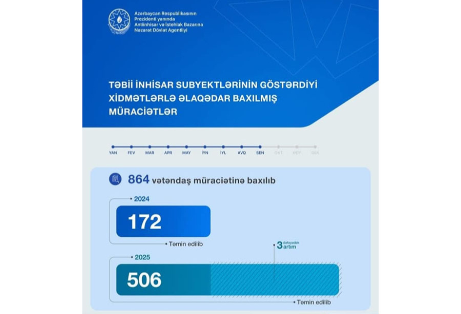 2025-ci ilin yanvar-sentyabr ayları ərzində təbii inhisar subyektlərinin göstərdiyi xidmətlərlə əlaqədar Antiinhisar və İstehlak Bazarına Nəzarət Dövlət Agentliyində ümumilikdə 864 vətəndaş müraciətinə baxılıb, onlardan 59 faizi təmin edilib. Dövlət Agentliyindən SİA-ya bildirilib ki, ötən ilin müvafiq dövrü ilə müqayisədə təmin edilmiş müraciətlərin sayında 3 dəfəyədək artım müşahidə olunub. Rəqabət siyasətinin əsas prinsiplərindən biri istehlakçıların və təbii inhisar subyektlərinin maraqlarının uzlaşdırılmasının təmin olunmasıdır.