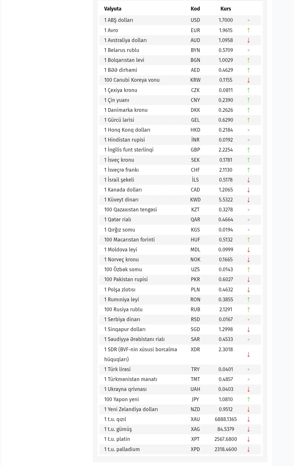 Azərbaycan Mərkəzi Bankı bu günün valyuta məzənnələrini açıqlayıb. SİA-nın məlumatına görə, noyabrın 21-də ABŞ dollarının məzənnəsi dəyişməyərək 1,7000 manat, Türkiyə lirəsi isə 0,0401 manat təşkil edib. Evro 1,9615 manatadək, Rusiyanın 100 rublu isə 2,1291 kimi bahalaşıb.