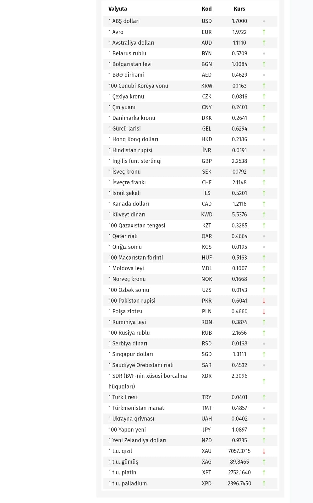 Azərbaycan Mərkəzi Bankı bu günün valyuta məzənnələrini açıqlayıb. SİA-nın məlumatına görə, noyabrın 27-də ABŞ dollarının məzənnəsi dəyişməyərək 1,7000 manat təşkil edib. Türkiyə lirəsi 0,0401 manatadək, Rusiyanın 100 rublu 2,1656 kimi, avro isə 1,9722 manatadək bahalaşıb.