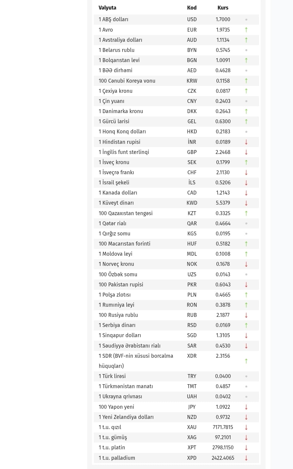 Azərbaycan Mərkəzi Bankı bu günün valyuta məzənnələrini açıqlayıb. SİA-nın məlumatına görə, dekabrın 2-də ABŞ dollarının məzənnəsi dəyişməyərək 1,7000 manat, Türkiyə lirəsi 0,0400 manat təşkil edib. Rusiyanın 100 rublu 2,1877 kimi ucuzlaşıb, avro isə 1,9735 manatadək bahalaşıb.