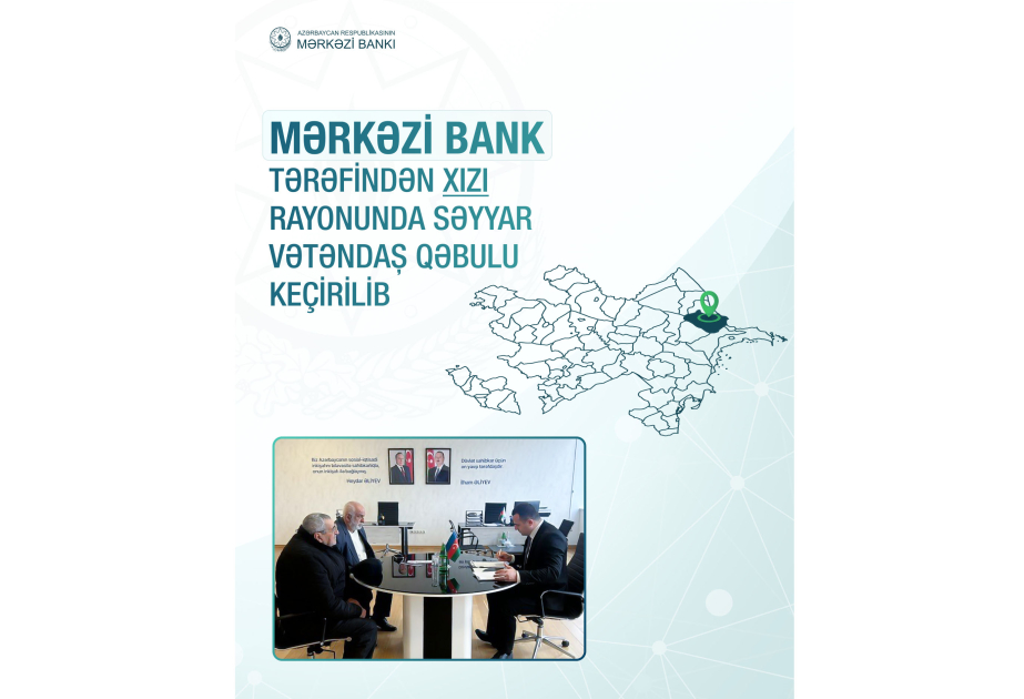 Maliyyə xidmətləri sahəsində vətəndaşların hüquqlarının qorunması, habelə onlara göstərilən xidmət səviyyəsinin yüksəldilməsi istiqamətində Azərbaycan Mərkəzi Bankı (AMB) tərəfindən görülən mütəmadi tədbirlərin davamı olaraq Xızı rayonunda vətəndaşların səyyar görüşü keçirilib. AMB-dən SİA-ya bildirilib ki, vətəndaşların müraciətləri əsasən kredit istəyi və kredit müqaviləsi üzrə qoyulmuş öhdəliklərə güzəştlərin tətbiqi, fəaliyyəti dayandırılmış filialın yenidən bərpası ilə bağlı təklif və sorğular ilə bağlı olub.