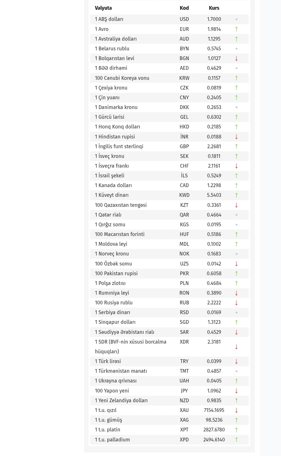 Azərbaycan Mərkəzi Bankı bu günün valyuta məzənnələrini açıqlayıb. SİA-nın məlumatına görə, dekabrın 8-də ABŞ dollarının məzənnəsi dəyişməyərək 1,7000 manat təşkil edib. Türkiyə lirəsi 0,0399 manata, Rusiyanın 100 rublu 2,2222 kimi ucuzlaşıb, avro isə 1,9814 manatadək bahalaşıb.