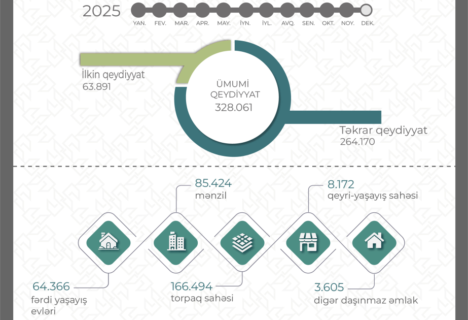 Bu ilin yanvar-noyabr ayları ərzində fərdi yaşayış və bağ evi üzərində – 64 min 366, mənzil – 85 min 424, torpaq sahəsi – 166 min 494, qeyri-yaşayış binası – 2832, qeyri-yaşayış sahəsi – 8172, əmlak kompleksi – 667, çoxmərtəbəli yaşayış binası – 103 və çoxillik əkmələr üzərində – 3 mülkiyyət hüququnun dövlət qeydiyyatı aparılıb. Bu dövrdə qeydiyyata alınan mülkiyyət hüquqlarının 91 min 917-si Bakı şəhərinin, digər hissəsi isə bölgələrin payına düşür.