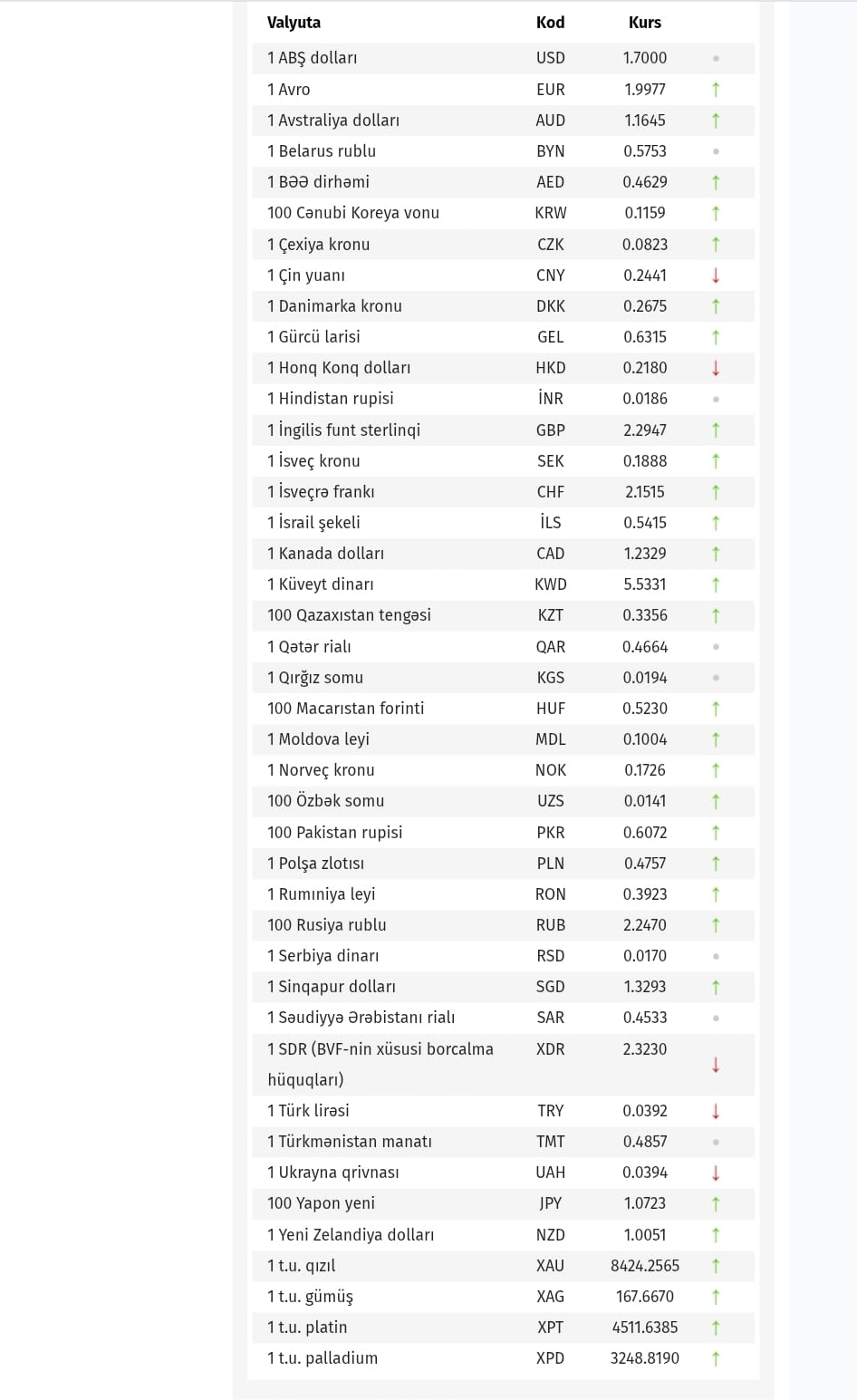Azərbaycan Mərkəzi Bankı bu günün valyuta məzənnələrini açıqlayıb.