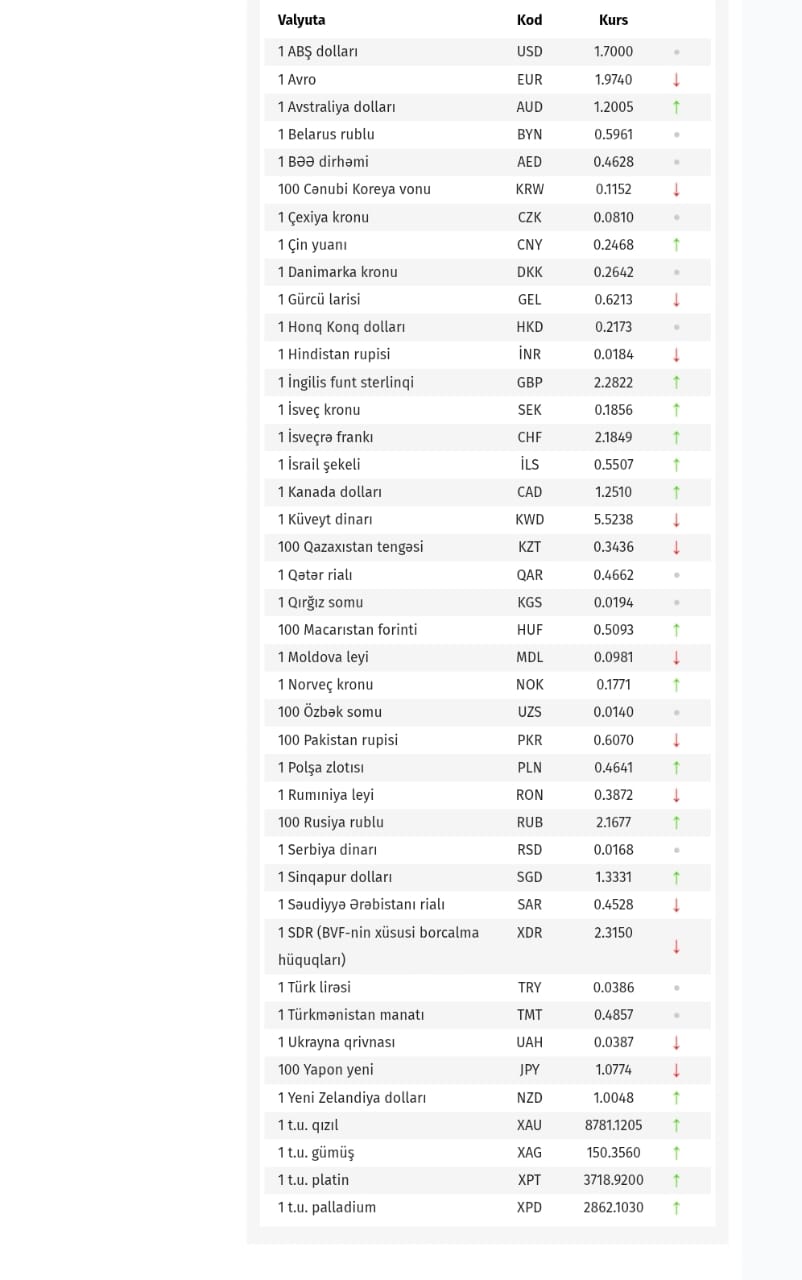 Azərbaycan Mərkəzi Bankı bu günün valyuta məzənnələrini açıqlayıb.