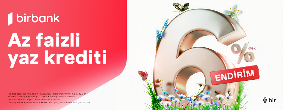Ölkənin birinci bankı Kapital Bank Novruz Bayramı münasibətilə “Az faizli yaz krediti” kampaniyasına start verir. Kampaniya çərçivəsində 12 mart - 30 aprel 2026-cı il tarixlərində bankdan 50 000 manatadək nağd kredit əldə edən hər kəs 6%-dək endirim qazanmaq şansına sahibdir. Bayram öncəsi bu fürsəti dəyərləndirib, planlarınızı həayata keçirmək cəmi bir neçə dəqiqə vaxtınızı alacaq. Bunun üçün Birbank mobil tətbiqinə daxil olaraq kredit müraciəti etmək yetərlidir. Həmçinin, Kapital Bank/Birbank filiallarına da yaxınlaşaraq kampaniyadan yararlanmaq mümkündür. “Az faizli yaz krediti” kampaniyasından Kapital Bank/Birbank müştəriləri ilə yanaşı əməkhaqqı və təqaüd kartları digər bankda olan vətəndaşlar da faydalana bilərlər.