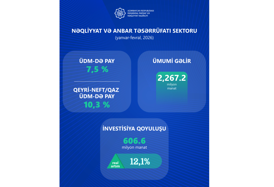 Ümumilikdə nəqliyyat və anbar təsərrüfatı sektorunda qeydə alınan müsbət dinamika ölkənin logistika imkanlarının gücləndiyini və regional nəqliyyat qovşağı kimi mövqeyinin möhkəmləndiyini göstərir.