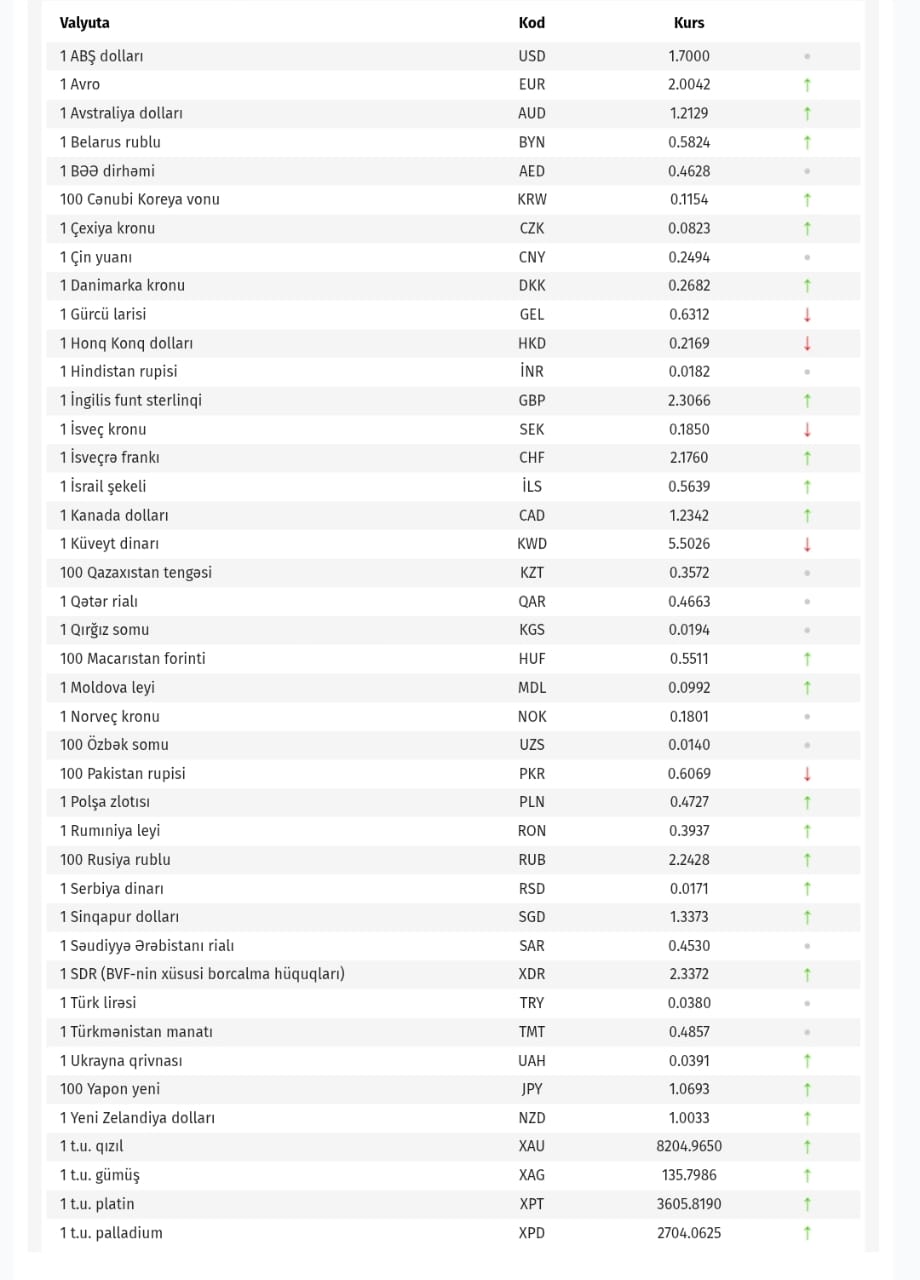 Azərbaycan Mərkəzi Bankı bu günün valyuta məzənnələrini açıqlayıb.