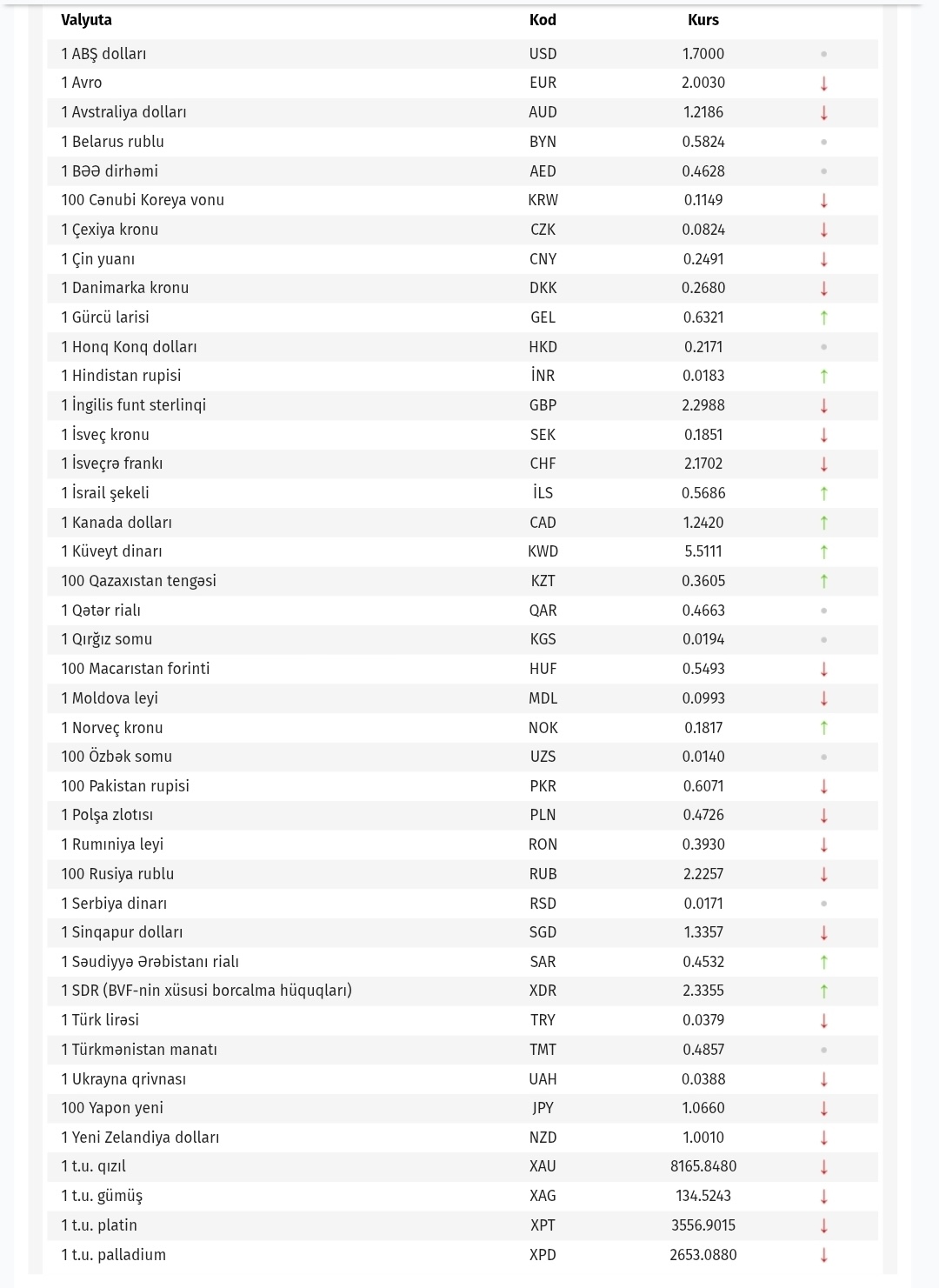 SİA-nın məlumatına görə, aprelin 17-də ABŞ dollarının məzənnəsi dəyişməyərək 1,7000 manat təşkil edib. Türkiyə lirəsi 0,0379 manata kimi, avro 2.0030 manatadək, Rusiyanın 100 rublu isə 2.2257 manatadək ucuzlaşıb.