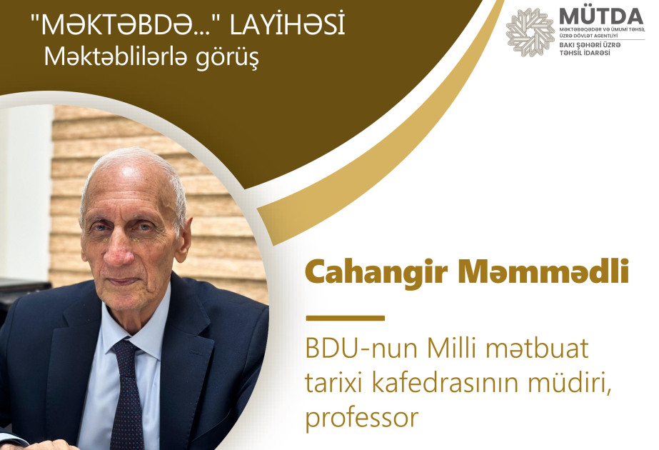 Bakı Şəhəri üzrə Təhsil İdarəsi tərəfindən reallaşdırılan “Məktəbdə...” layihəsinin yeni dərs ilində ilk görüşü oktyabrın 16-da paytaxtdakı 21 nömrəli tam orta ümumtəhsil məktəbində keçiriləcək. Təhsil İdarəsindən SİA-ya bildirilib ki, layihənin budəfəki qonağı Bakı Dövlət Universitetinin Milli mətbuat tarixi kafedrasının müdiri professor Cahangir Məmmədli olacaq.