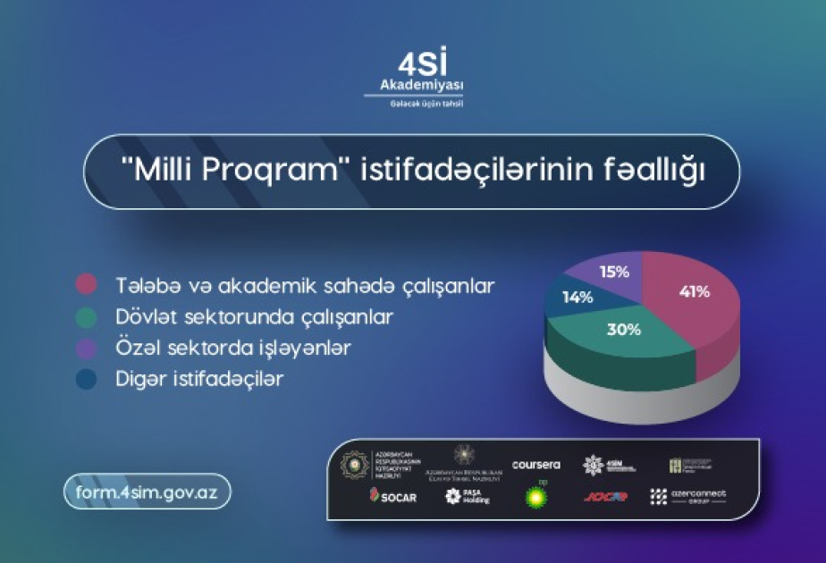 “4Sİ Akademiyası” çərçivəsində “Milli Proqram”da indiyədək 37 min 500 nəfər “Coursera” platformasındakı təlimlərdən faydalanıb. İstifadəçilər 193 mindən çox təlimə müraciət edib və 69 min təlimi uğurla başa vurublar. İqtisadiyyat Nazirliyinin tabeliyində Dördüncü Sənaye İnqilabının Təhlili və Koordinasiya Mərkəzi (4SİM) və Təhsilin İnkişafı Fondunun birgə əməkdaşlığı ilə həyata keçirilən “4Sİ Akademiyası” çərçivəsində “Milli Proqram” üzrə iştirakçıların sayı artmaqda davam edir. Mərkəzdən SİA-ya bildirilib ki, təlim iştirakçılarının 29 faizini universitet tələbələri və ali təhsil müəssisələrinin əməkdaşları, 12 faizini isə akademik sferada (orta məktəblər, elmi-tədqiqat institutları və s.) fəaliyyət göstərənlər təşkil edir. On bir mindən çox tələbə və universitet əməkdaşı “Coursera” onlayn tədris platformasındakı 67 mindən çox təlimə (ümumi müraciətlərin 1/3-i) müraciət edib.