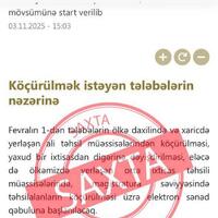 Son günlər sosial şəbəkələrdə tələbələrin köçürülməsi prosesinə dair saxta məlumat (şəkil) yayılıb. Həmin paylaşımlarda guya tələbələrin köçürülməsi prosesinə 1 fevral tarixindən etibarən başlanıldığı iddia olunur. Elm və Ali Təhsil üzrə Dövlət Agentliyindən SİA-ya verilən məlumata görə, yayılan bu məlumat həqiqətə uyğun deyil və rəsmi mənbələrdə yerləşdirilməyib.