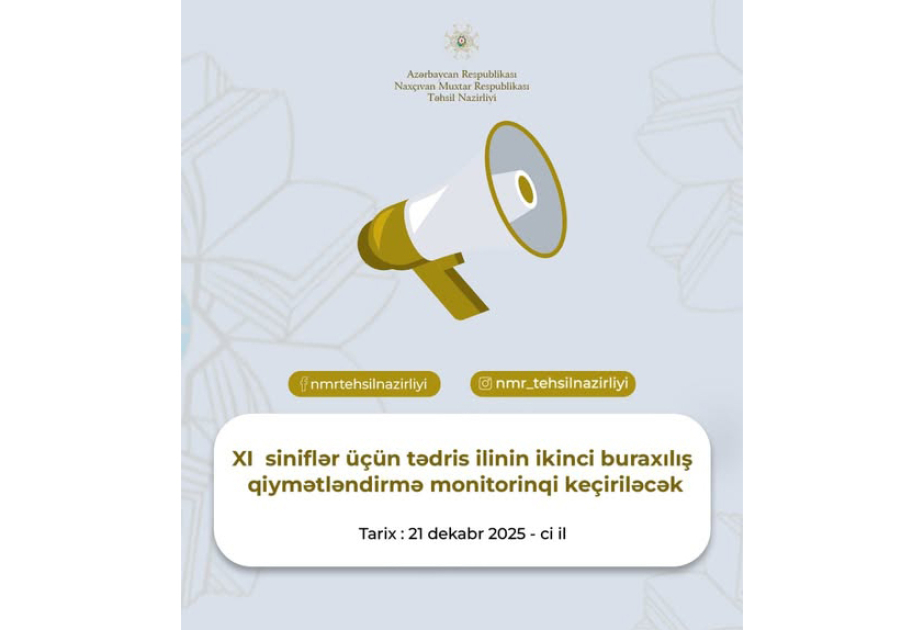 Naxçıvan Muxtar Respublikası Təhsil Nazirliyi tərəfindən dekabrın 21-də şagird nailiyyətlərinin mərkəzləşmiş qaydada monitorinqinin həyata keçirilməsi məqsədilə XI siniflər üçün buraxılış imtahanları modelinə uyğun olaraq tədris ilinin növbəti buraxılış qiymətləndirmə monitorinqi keçiriləcək.