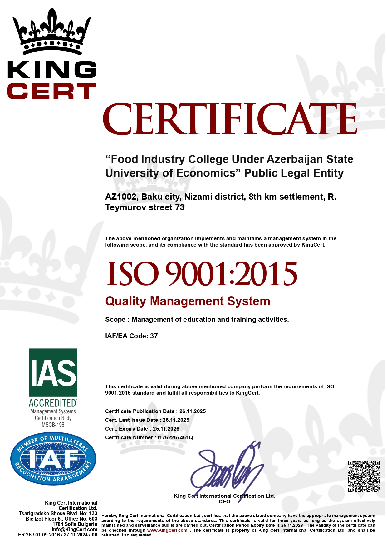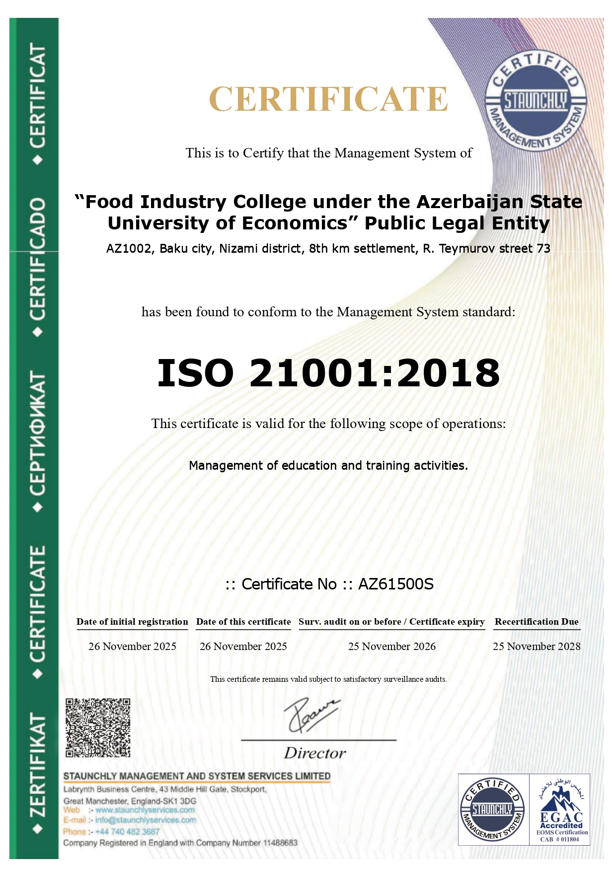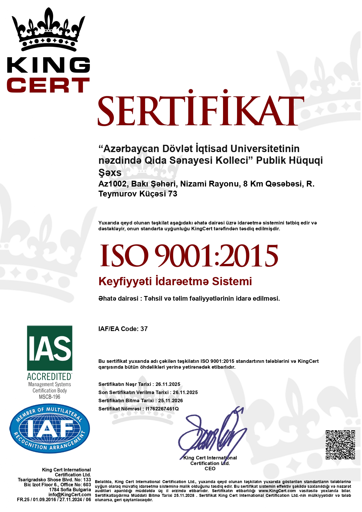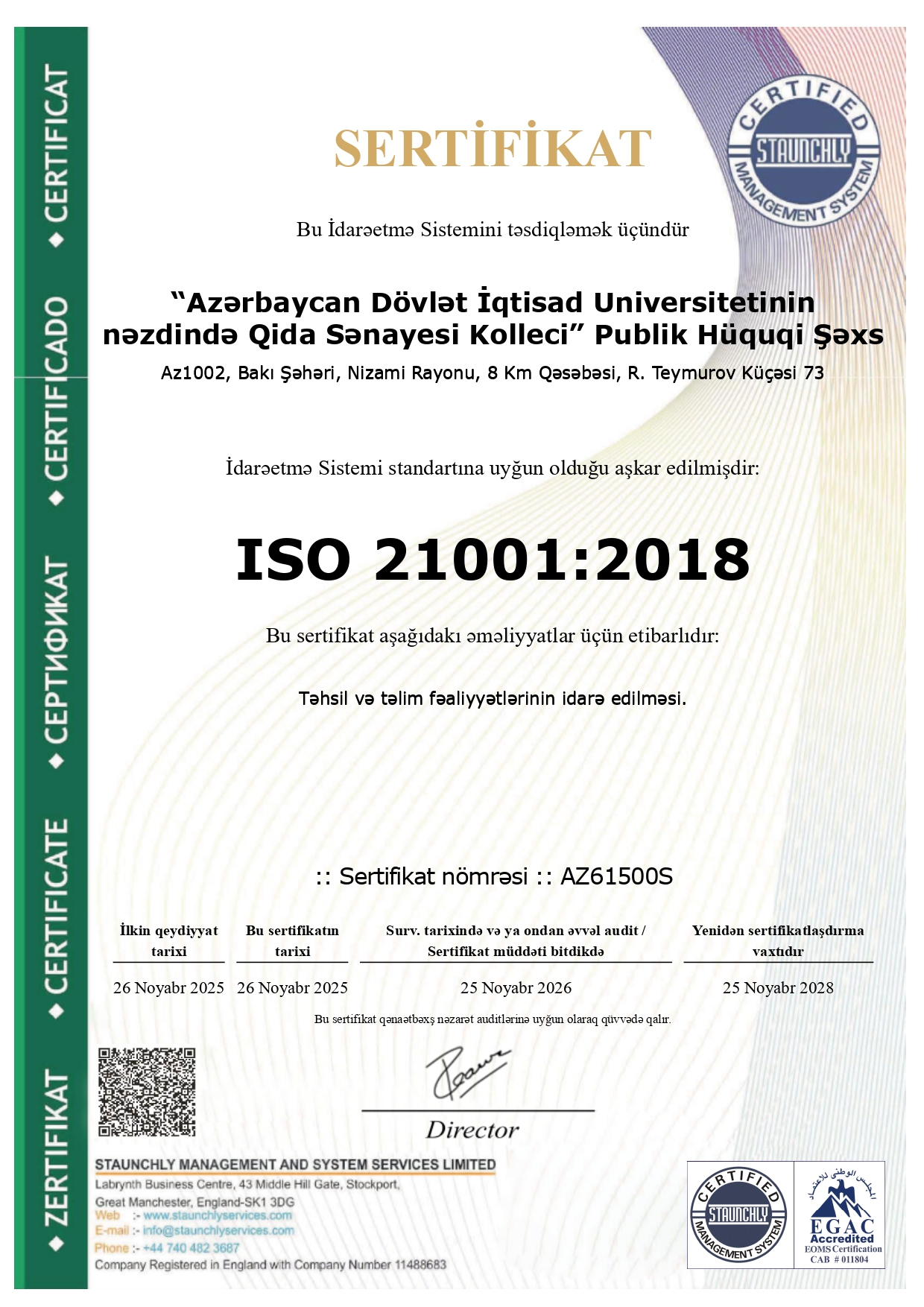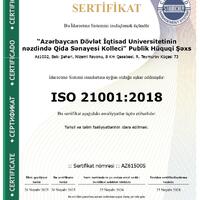 ISO 9001:2015 sertifikatı kollecdə inzibati idarəetmənin şəffaflığına və effektivliyin təmin edildiyinə, ISO 21001:2018 standartı isə təhsilin keyfiyyətinə, tələbə məmnuniyyətinə və tədris metodologiyasının beynəlxalq meyarlara uyğunluğuna zəmanət verir.