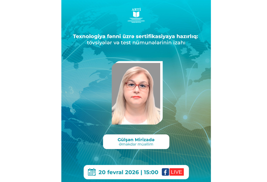 Təhsil İnstitutu tərəfindən təhsilverənlərin sertifikatlaşdırılması prosesinə dəstək məqsədilə fevralın 20-si saat 15:00-da “Texnologiya fənni üzrə sertifikasiyaya hazırlıq: tövsiyələr və test nümunələrinin izahı” mövzusunda vebinar keçiriləcək.