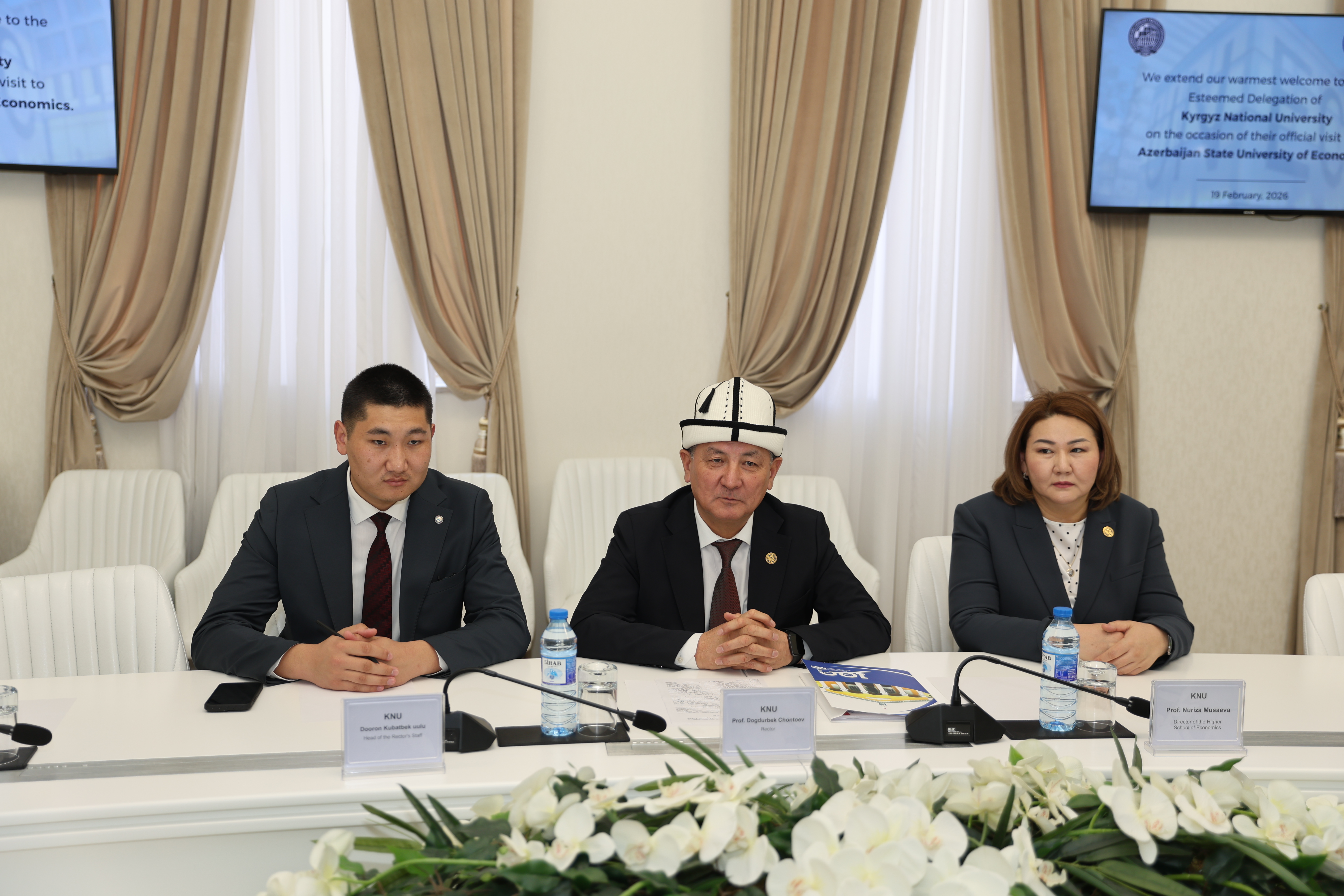 UNEC-in rektoru, professor Ədalət Muradovla keçirilən görüşdə hər iki ali təhsil müəssisəsi arasında əməkdaşlığın genişləndirilməsi istiqamətləri müzakirə olunub. Qeyd edilib ki, ötən ilin sonunda UNEC nümayəndə heyəti Qırğızıstanda səfərdə olaraq Qırğız Milli Universitetində danışıqlar aparıb. Həmin səfər zamanı əldə olunan razılaşmaların davamı olaraq Bakıda keçirilən görüşdə konkret əməkdaşlıq istiqamətləri barədə fikir mübadiləsi aparılıb.