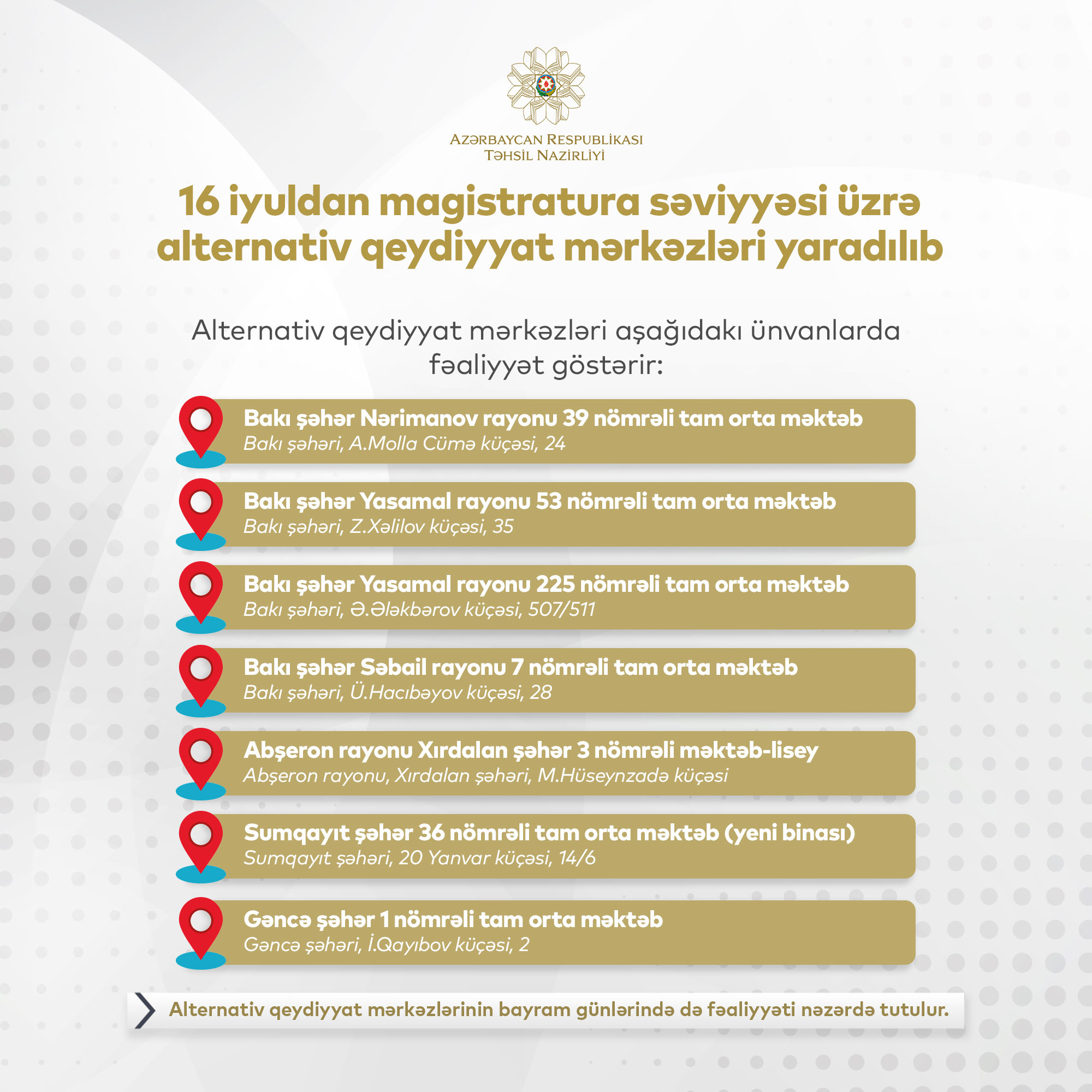 İyulun 16-dan ali təhsilin magistratura səviyyəsi üzrə təhsil müəssisələrinə elektron qeydiyyat prosesinə dəstək olmaq üçün alternativ qeydiyyat mərkəzləri fəaliyyət göstərəcək. SİA xəbər verir ki, alternativ qeydiyyat mərkəzlərinin yaradılmasında məqsəd tələbələrə yaradılan imkanların genişləndirilməsidir.