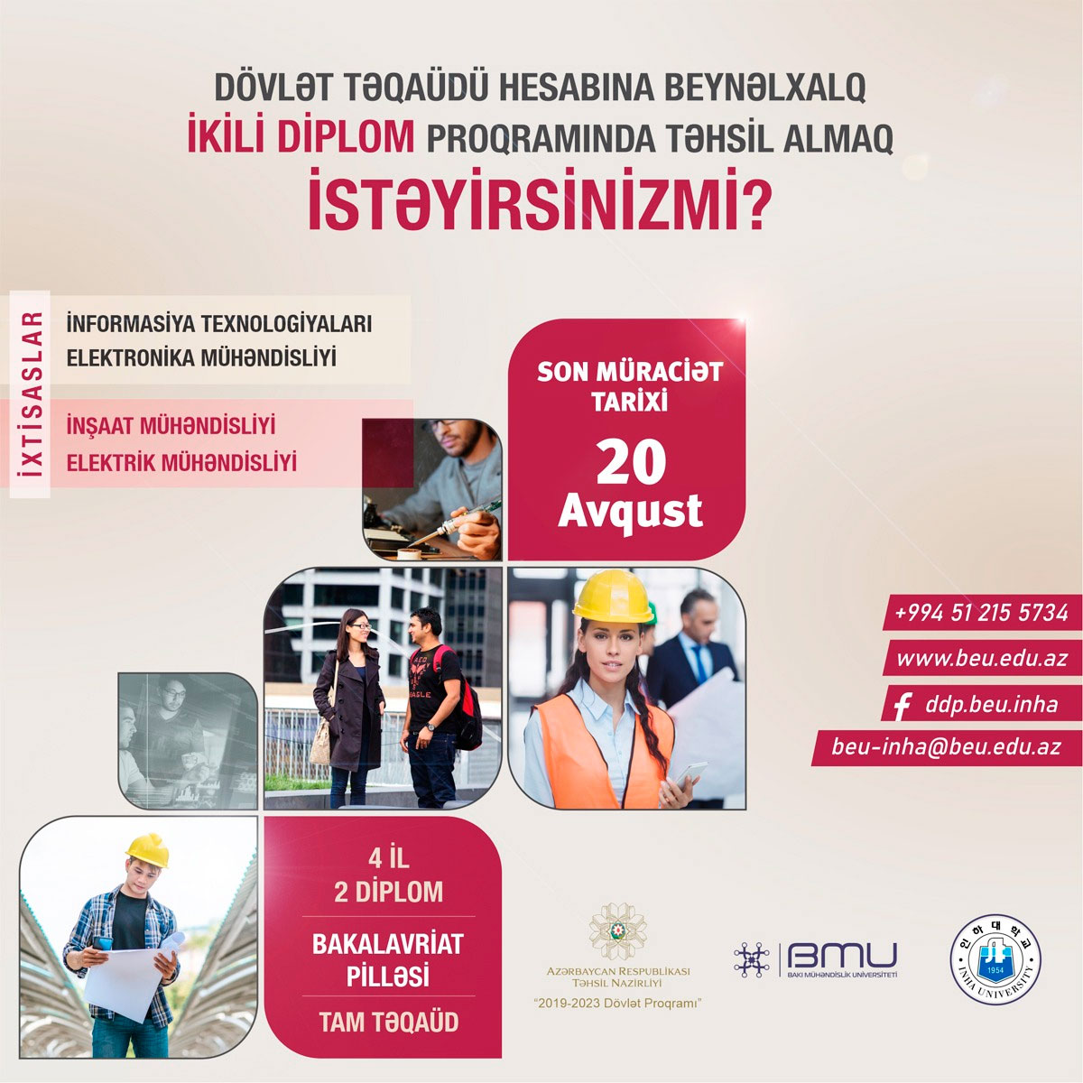 2021-2022-ci tədris ili üçün Bakı Mühəndislik Universiteti və Cənubi Koreyanın nüfuzlu ali təhsil müəssisəsi olan İNHA Universiteti tərəfindən həyata keçirilən beynəlxalq ikili diplom proqramının (BMU-İNHA İDP) bakalavr pilləsinə onlayn qeydiyyat davam edir. SİA xəbər verir ki, müraciət üçün son tarix 20 avqust saat 23:55 müəyyən edilib. Namizədlər müvafiq sənədləri göstərilən tarixədək onlayn anket formasında təqdim etməlidirilər.