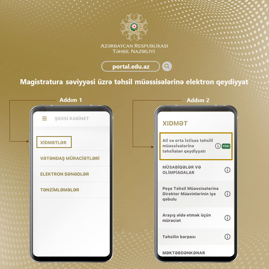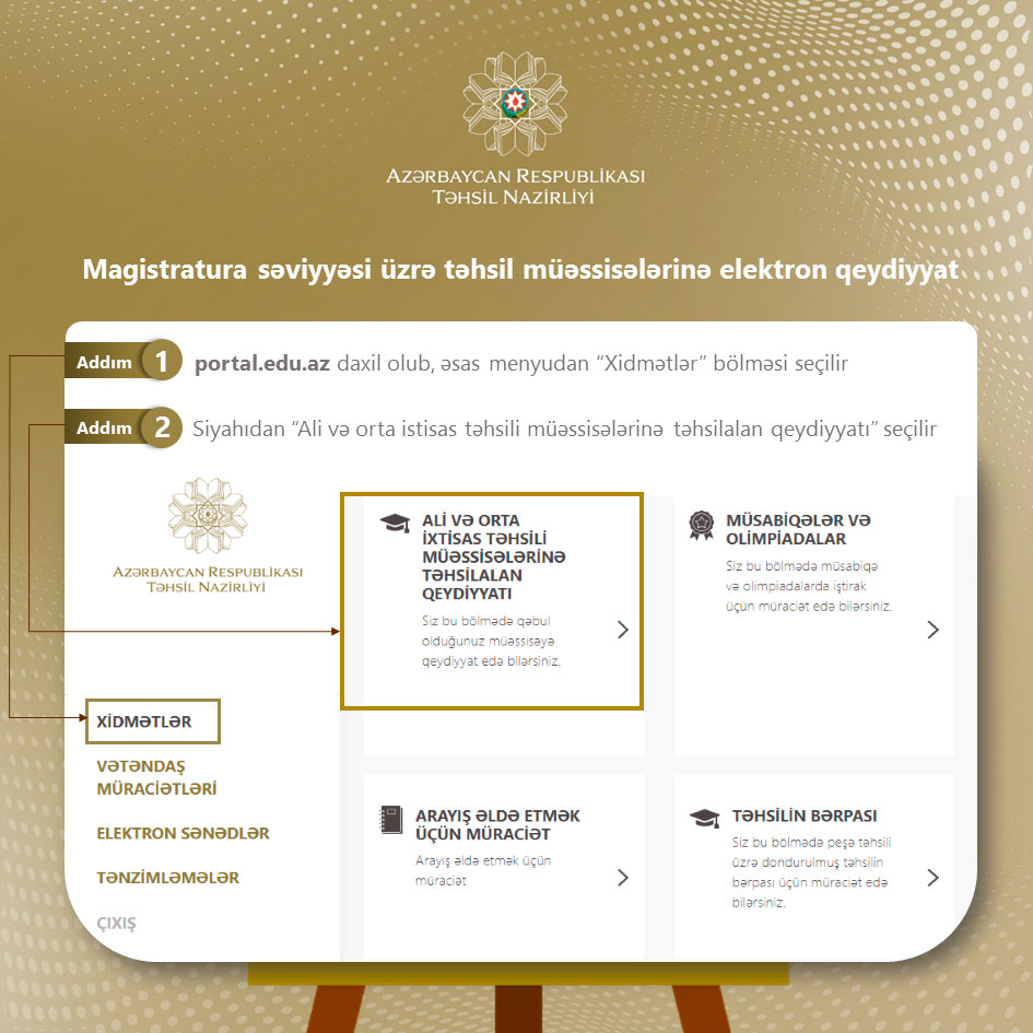 Müraciət üçün https://portal.edu.az/ portalında qeydiyyatdan keçmək, yaradılmış kabinetə daxil olduqdan sonra təqdim edilən xidmətlər sırasında “Ali və orta ixtisas təhsil müəssisələrinə təhsilalan qeydiyyatı” xidmətini seçmək lazımdır. Açılan səhifədə müvafiq qəbul xətti üzrə şəxsi məlumatların və qəbul məlumatlarının daxil edilməsi, sosial güzəşt üçün məlumatların təqdim edilməsi və təhsil haqqının icra edilməsi mümkün olur.