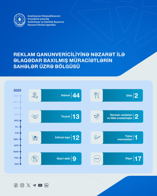 Hesabat dövründə baxılıan müraciətlərin 44-ü xidmət, 13-ü ticarət, 9-u qeyri-qida, 12-si ictimai iaşə, 2-si dərman vasitələri və tibbi avadanlıqlar, 2-si qida, 1-i tütün məmulatları, 17-si isə digər sahələrə aid olub.