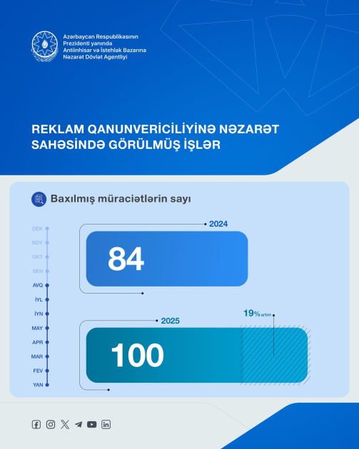 Cari ilin yanvar-avqust ayları ərzində qanunsuz reklamların yayımı ilə əlaqədar Antiinhisar və İstehlak Bazarına Nəzarət Dövlət Agentliyi tərəfindən 100 müraciətə baxılıb. Dövlət Agentliyindən SİA-ya bildirilib ki, bu, ötən ilin eyni dövrü ilə müqayisədə 19 faiz çoxdur.