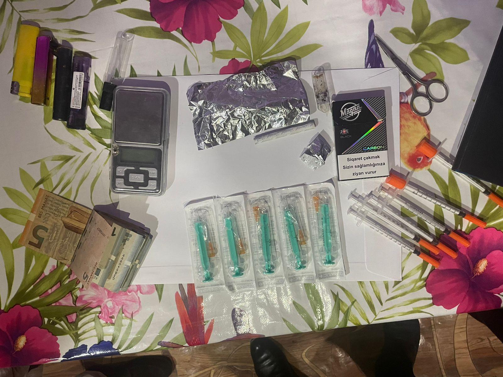 Keçirilən əməliyyat-axtarış tədbirləri nəticəsində həmin şəxs də saxlanılaraq Polis Şöbəsinə gətirilib. Üzərinə, eləcə də yaşadığı ünvana keçirilən baxış zamanı heroin, elektron tərəzi və şprislər aşkar olunaraq maddi sübut kimi götürülüb.