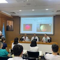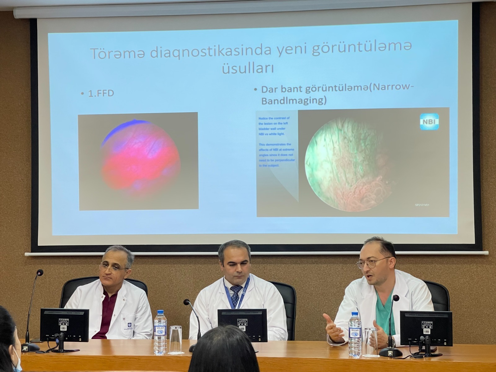 Təqdimatında sidik kisəsi törəmələrinin risk faktorları, əlamətləri, diaqnostikası, müalicə üsulları haqqında ətraflı məlumat verən həkim-rezident Elxan Qasımov bildirib ki, siqaret çəkmə, xüsusilə hal-hazırda istifadəsi geniş yayılmış elektron siqaretlər, şistomiyazis, peşə faktotu və digər səbəblər risk faktorlarındadır. Diaqnostikasında fiziki müayinə, USM, KT Uroqrafiya və İV pieloqrafiya, KT, MRT və sistoskopiydan istifadə olunur. Təqdimatın sonunda Elxan Qasımov sidik kisəsi törəmələrinin müalicəsində istifadə olunan ən müasir yanaşmalar və dünya təcrübəsi barədə danışıb.
